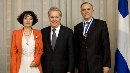 Le premier ministre, entouré de Mme Chantal Moreno, C.Q., et du général Jean-Pierre Kelche, G.O.Q.