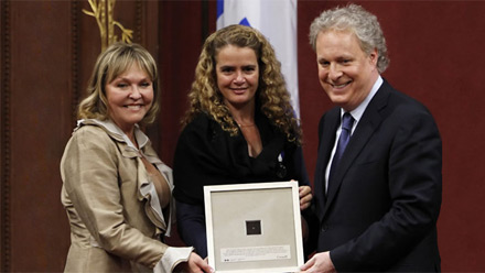 Le premier ministre, M. Jean Charest, et la présidente du Conseil de l'Ordre national du Québec, Mme Maryse Lassonde, C.Q., recevant de l'astronaute Julie Payette, C.Q., la microplaquette sur laquelle le nom des membres de l'Ordre national est inscrit à l'échelle nanométrique.